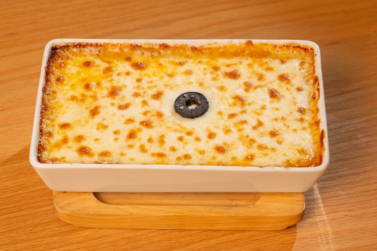 English: Layers of pasta with minced meat, tomato sauce, and melted cheese.