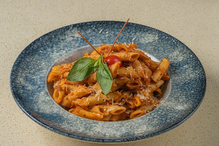 English: Penne pasta in a spicy tomato and garlic sauce.