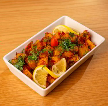 English: Golden fried potato cubes served with special seasoning.