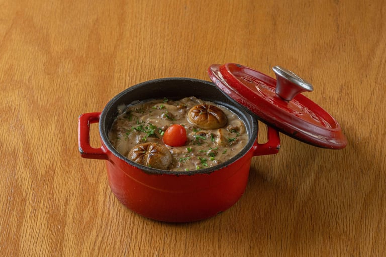 English: A traditional dish of seasoned minced meat mixed with potatoes.