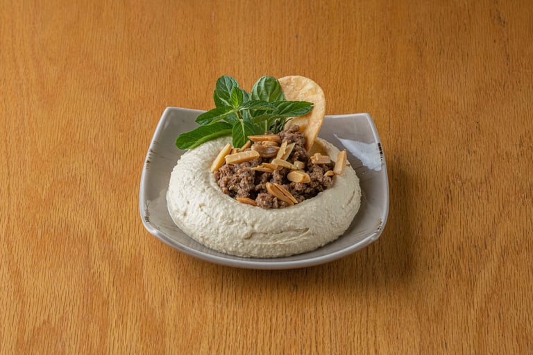 العربية: حمص ناعم مُزيّن بلحم مفروم محمّر وصنوبر.