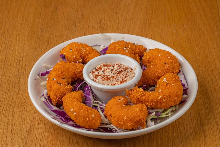 English: Lightly breaded crispy shrimp served with dipping sauce.
