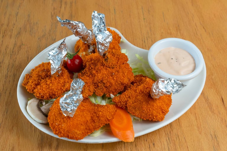 English: Crispy breaded chicken wings fried to golden perfection.