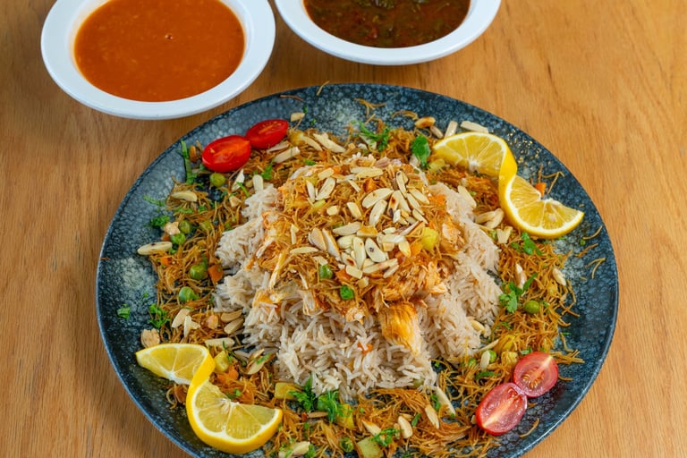 العربية: أرز بسمتي مع دجاج متبّل ومطبوخ مع التوابل والزعفران العطري.