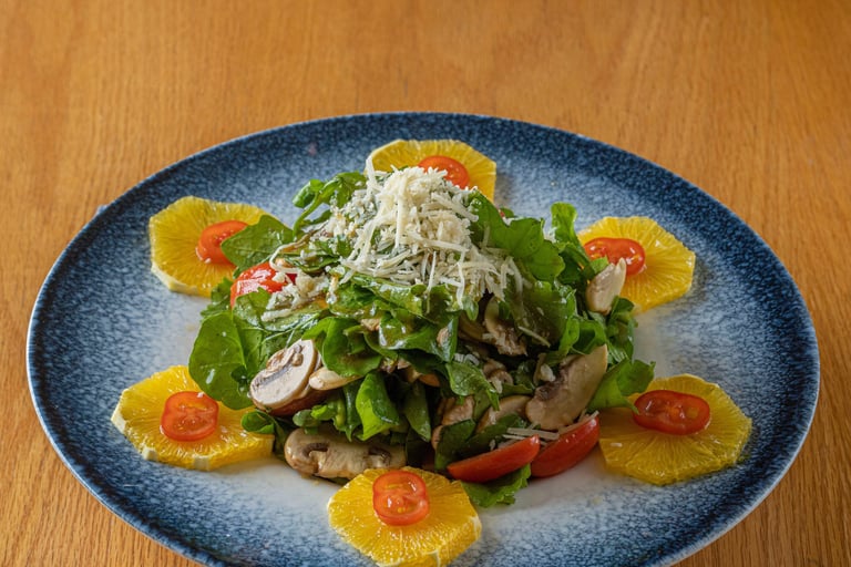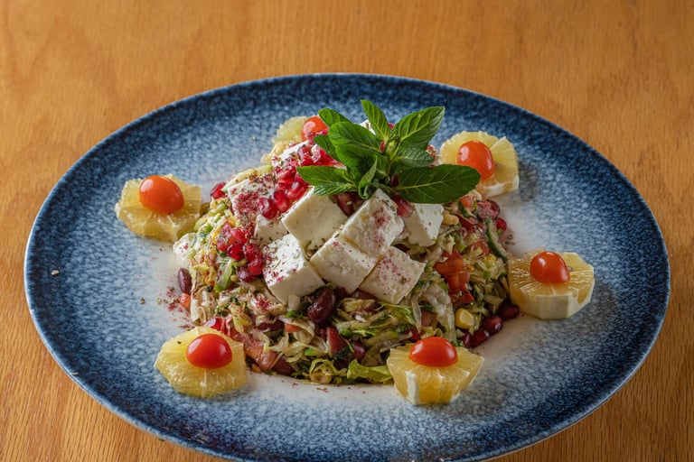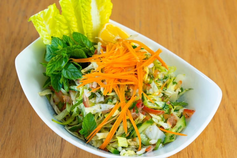 العربية: سلطة خضار طازجة مشكلة تُقدّم مع صوص خفيف منعش.