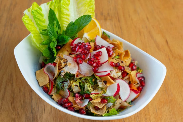 العربية: سلطة شامية تقليدية مع خبز محمّص وخضار طازجة وصوص السُمّاق المنعش.
