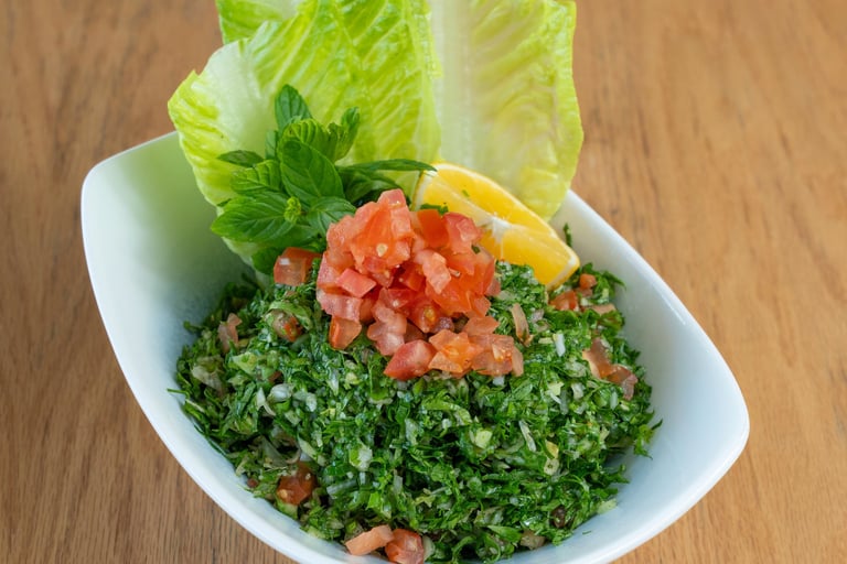 العربية: تبولة طازجة من البقدونس والطماطم والبرغل مع عصير الليمون وزيت الزيتون.