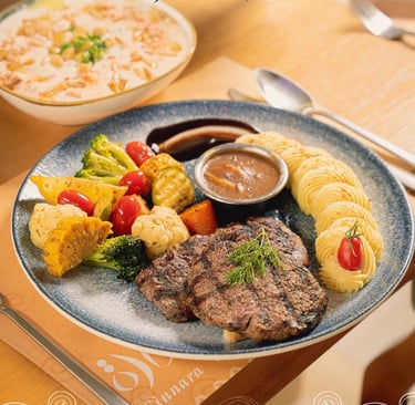 العربية: شريحة لحم مشوية تُقدّم مع الصوص والخضار حسب الاختيار.