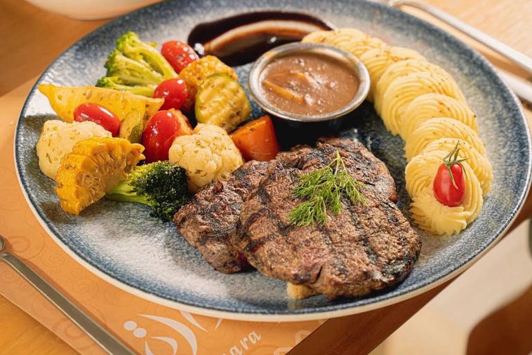English: Grilled beef steak served with choice of sauce and vegetables.