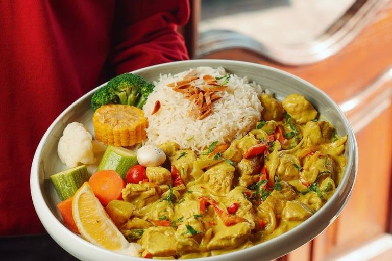 العربية: دجاج طري مطبوخ في صوص كاري غني وعطري.