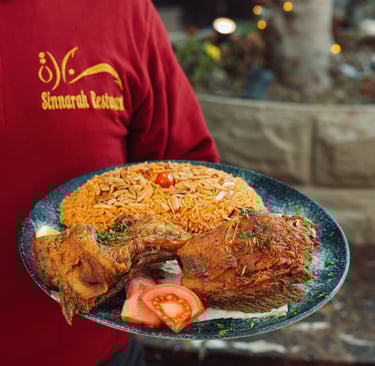 العربية: أرز بسمتي مع دجاج متبّل ومطبوخ مع التوابل والزعفران العطري.